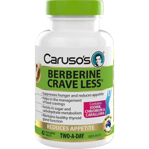 Caruso's BERBERINE CRAVE LESS® contains a high extract ratio of Berberis aristata, which has been standardised to the herbal constituent, Berberine. Berberis aristata has been traditionally used in Ayurvedic medicine as a hepatoprotectant (to protect the liver) and to support the flow of bile, while Caralluma plays an important role in helping to manage food cravings and suppress the appetite. The trace minerals Iodine and Chromium have various actions and in this formulation. Iodine supports the body's metabolic rate, along with supporting healthy thyroid gland function and energy production. Chromium assists in the digestion and metabolism of carbohydrates including sugar and maintains healthy blood sugar in healthy individuals.