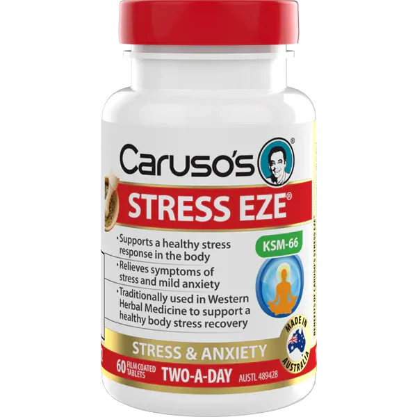 Caruso’s Stress EZE® relieves symptoms of stress and mild anxiety. It contains a blend of herbal ingredients including KSM-66 Ashwagandha® to support a healthy stress response in the body, and standardised extracts of Siberian Ginseng and Korean Ginseng which have been used traditionally in Western Herbal Medicine to relieve fatigue.