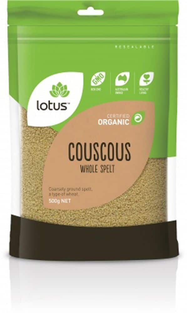 Lotus Organic Whole Spelt Couscous is certified organic, suitable for vegan, source of protein, and source of fibre.