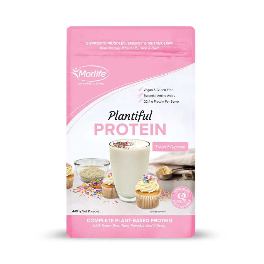 Support recovery, energy, and focus all in one. More than just a plant-based protein, Frosted Cupcake Plantiful Protein delivers 22.4 g of complete protein plus essential nutrients like Iron, Magnesium, Zinc and B12 to help you repair muscles, boost metabolism and stay sharp. Perfect for vegans, fitness lovers and anyone wanting to feel fuller for longer. It is the ultimate blend to help you feel the difference and thrive.